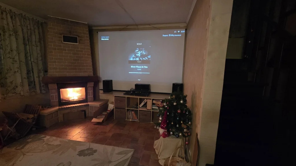 * В гостиной — проектор и экран 140” (полноценный домашний кинотеатр)
